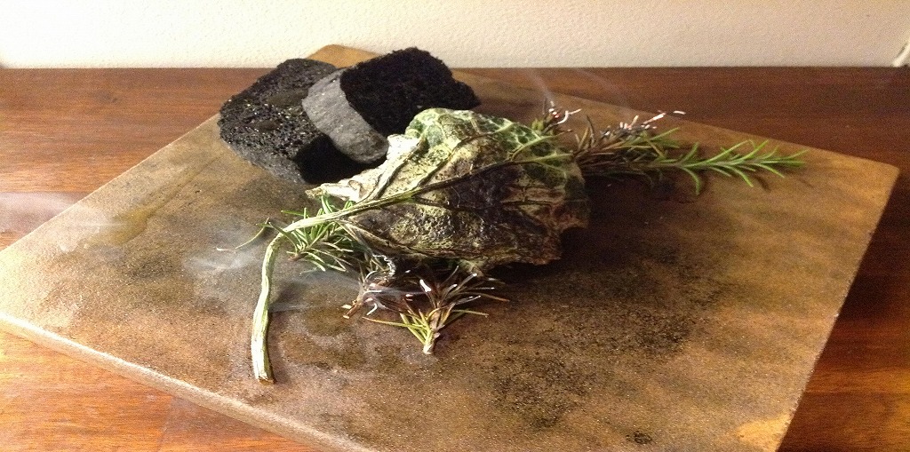 松の枝で香りをつけたヒラメ セロリアックの泡 キャビア