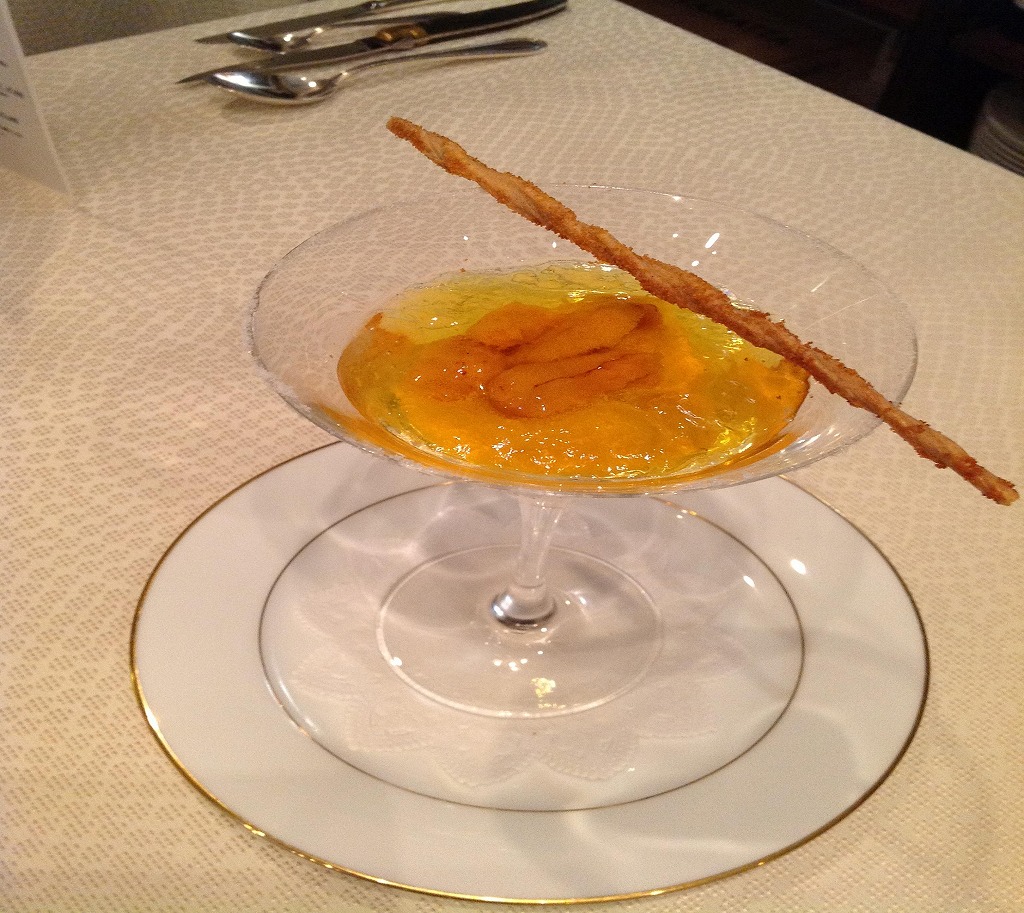 自家菜園の人参ムース 雲丹 サフランと海のジュレ